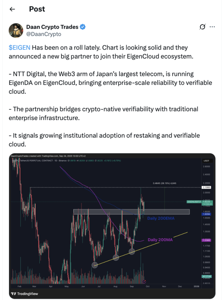 Dari sisi teknikal, grafik yang dibagikan Daan menunjukkan bahwa harga $EIGEN berhasil menembus area resistance utama di sekitar $1.65 dan kini bergerak mendekati target potensi di atas $2.10, yang merepresentasikan kenaikan sekitar 28%. Terlihat juga bahwa garis EMA 200 hari dan MA 200 hari kini berfungsi sebagai support dinamis, menambah kekuatan struktur harga saat ini.