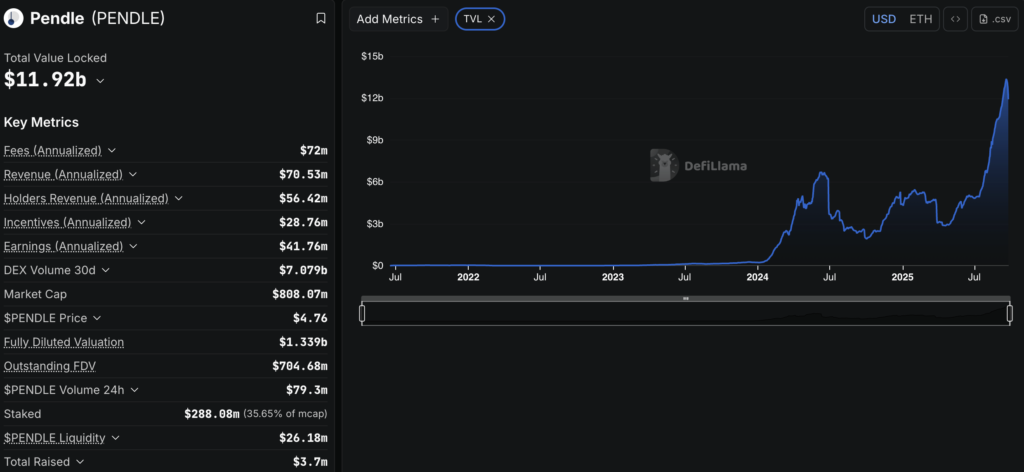 Platform DeFi Pendle (PENDLE) mencatat performa luar biasa di tahun 2025 dengan Total Value Locked (TVL) yang menembus angka $11,92 miliar. Grafik TVL yang diambil dari DeFiLlama menunjukkan pertumbuhan eksponensial sejak awal 2024, dengan akselerasi tajam dalam beberapa bulan terakhir, menandakan peningkatan adopsi dan kepercayaan investor terhadap protokol ini.