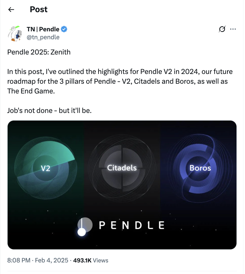 Memasuki usia ke-4, Pendle semakin memperkuat posisinya sebagai pemain kunci di sektor DeFi on-chain. Dengan TVL yang kembali menembus $11 miliar, protokol ini digadang-gadang siap melanjutkan kepemimpinannya di 2025 melalui inovasi dan adopsi yang terus berkembang.