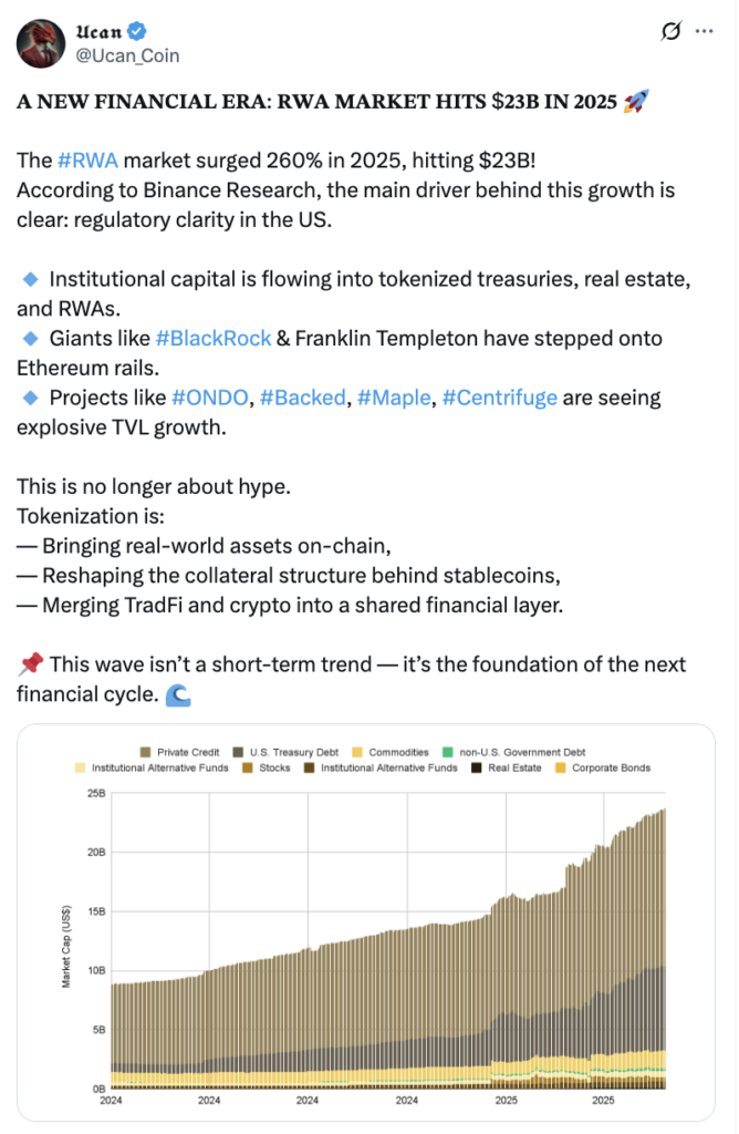 Namun, kejutan terbesar justru datang dari sektor aset dunia nyata yang ditokenisasi. Sepanjang paruh pertama tahun 2025, pasar RWA melonjak hingga 260%, mencapai valuasi sebesar $23 miliar. Saat ini, pertumbuhan sektor ini didominasi oleh kredit swasta (58%) dan obligasi pemerintah AS (34%).