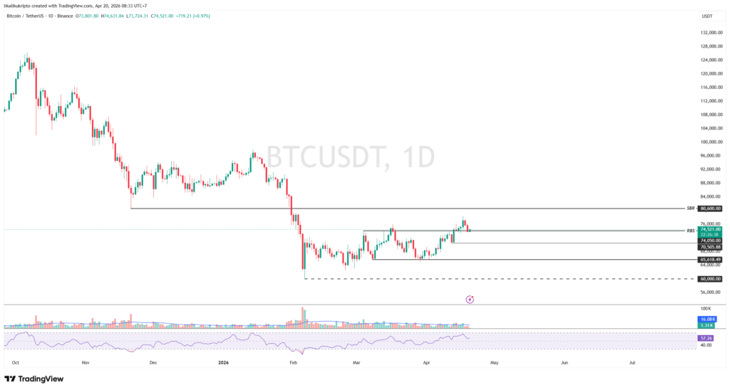 Sebagai aset utama di pasar kripto, Bitcoin saat ini berada dalam fase yang sangat kritis. Harga bergerak di sekitar area $74.000, yang kini berperan sebagai support penting (RBS).