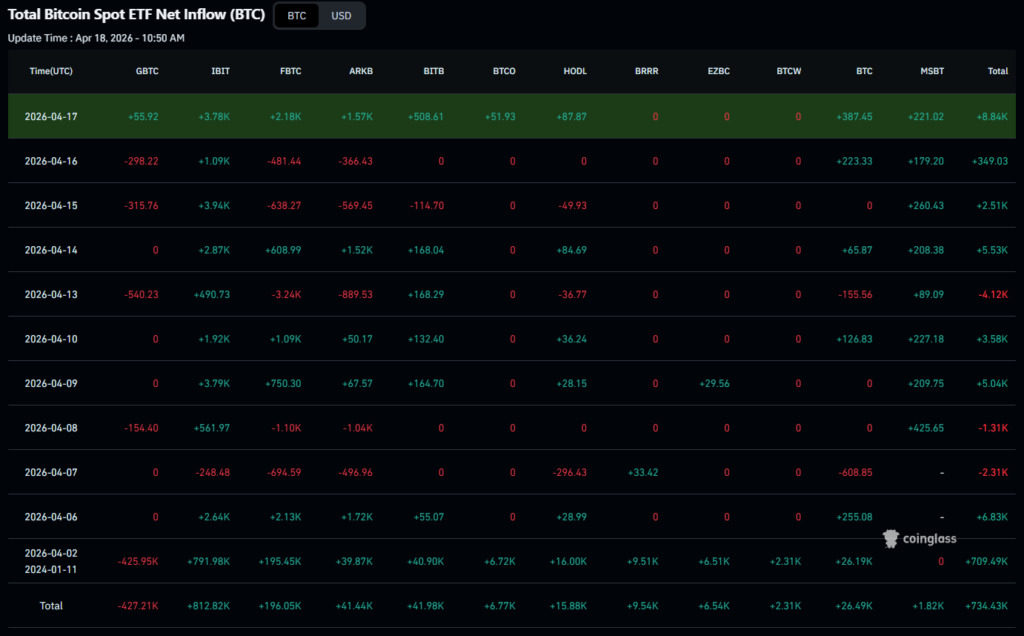 - Lonjakan Arus Dana Institusi: Pada 17 April, terjadi peningkatan signifikan arus masuk (inflow) ETF Bitcoin, mencerminkan mulai adanya akumulasi oleh investor institusional, bahkan sehari sebelum terjadinya penutupan Selat Hormuz.