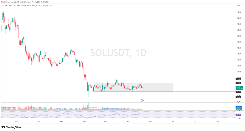 Solana, sebagai aset dengan volatilitas lebih tinggi, saat ini juga berada dalam fase konsolidasi yang cukup jelas, yaitu di range $76,59 hingga $91,25.
