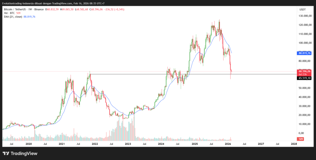 Bitcoin masih berada di dalam downtrend-nya. Setelah sempat turun ke $60.000, Bitcoin berhasil bertahan di area support kuat, yaitu puncak harga pada bull run 2021. Meskipun begitu, terhadap tekanan dari situasi ketidakpastian global, kebijakan the Fed, dan penundaan regulasi CLARITY Act. Baca analisis pasar crypto 16 Februari 2026 di bawah!