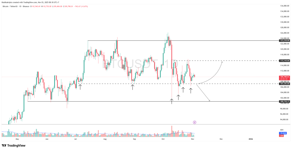 Jika harga Bitcoin mampu breakout ke atas yang merupakan resistance, maka laju naik diperkirakan akan berlanjut dengan target kenaikan berada di level $123.218. Namun, jika harga Bitcoin turun, maka target berada pada support selanjutnya di level $100.718.