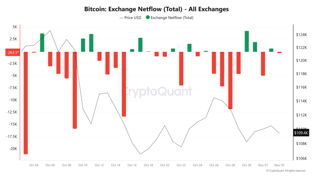 - Data menunjukkan dominasi aliran keluar (outflow) dari exchange sepanjang Oktober hingga awal November.