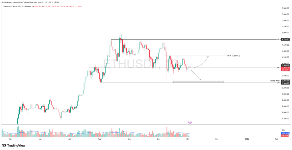 Horizontal level di $3.860, yang berperan sebagai area RBS (Resistance Become Support), menjadi titik krusial dalam menjaga momentum positif harga Ethereum (ETH).