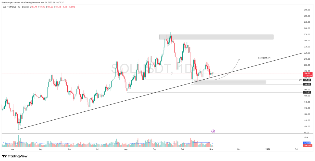 Sentimen pasar terhadap SOL masih terjaga karena harga mampu bergerak di atas garis uptrend serta mempertahankan posisi di atas area support terdekat. Zona support di kisaran $168,79–$175,69 berperan sebagai benteng pertahanan utama yang sejauh ini berhasil menahan tekanan jual.