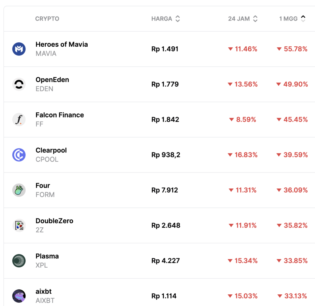 - Plasma ($XPL): Plasma (XPL) baru saja mencapai harga all-time low baru di angka $0,25. Sejak diluncurkan bulan lalu, XPL sudah mengalami penurunan sekitar -85%.