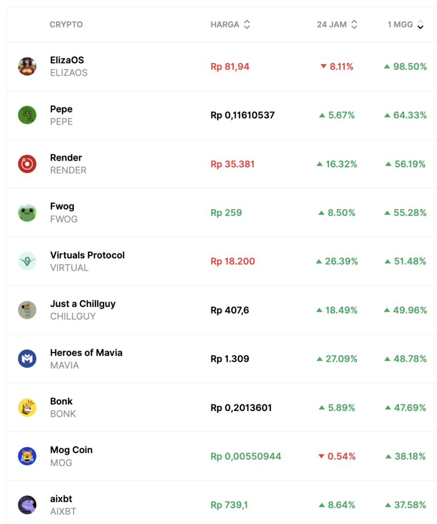 - “Memecoin Season”. Banyak aset kripto pada kategori memecoin mengalami kenaikan. Beberapa di antaranya bahkan mengalami kenaikan lebih dari 50% dalam 24 jam terakhir. Hal ini mengindikasikan aliran dana dari retail sudah mulai masuk lagi ke pasar kripto