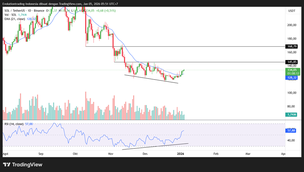 Secara teknikal, Solana juga menunjukkan sinyal bullish yang cukup kuat. Ditandai dengan harga berada di atas EMA 21 dan bullish divergence di RSI-nya.