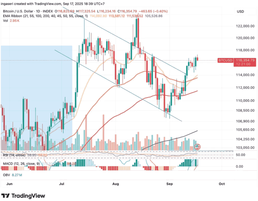 Selama seminggu terakhir, BTC mengalami reli yang cukup stabil, didukung oleh peningkatan optimisme investor terhadap pemangkasan suku bunga bank sentral AS. Harganya diperdagangkan dalam kisaran antara $114.000 hingga $117.000, dengan level resistensi dan dukungan yang semakin jelas. Para investor tampaknya menguji kisaran $116.000-$117.000, sementara level dasar yang kuat terbentuk di dekat $114.000 yang tampaknya menyerap sebagian besar tekanan jual pasar.