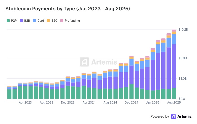 Berdasarkan data dari Artemis, penggunaan stablecoin sebagai alat pembayaran terus mengalami pertumbuhan sejak 2023 di berbagai segmen. Pada Agustus 2025, pembayaran stablecoin terbesar tercatat pada segmen B2B (Business-to-Business) dengan nilai transaksi mencapai USD 6,4 miliar. Sementara itu, segmen pembayaran berbasis kartu (card) mencatat nilai transaksi sebesar USD 1,6 miliar pada periode yang sama.