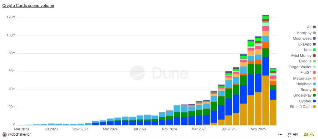 Ether.fi Cash merupakan penyedia kartu yang paling mendominasi dari sisi spend volume atau volume pembelanjaan sepanjang 2025. Tingginya penggunaan pada kedua platform ini dipengaruhi oleh berbagai faktor, mulai dari struktur biaya transaksi hingga kelengkapan fitur yang ditawarkan.