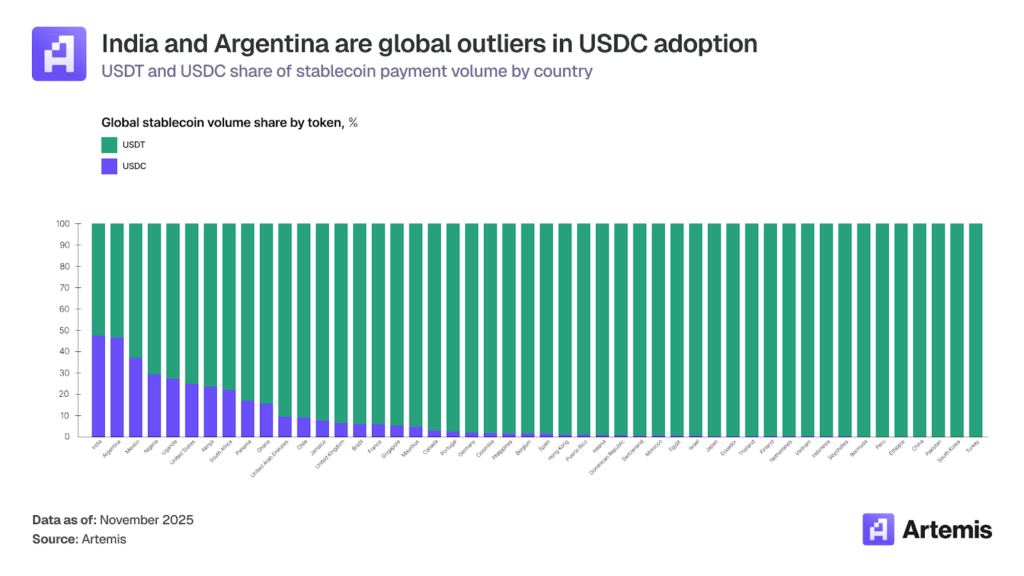 Mayoritas negara masih didominasi penggunaan USDT, namun India dan Argentina menjadi pengecualian karena adopsi USDC di kedua negara tersebut relatif berimbang dibandingkan USDT. Selain itu, negara-negara dengan inflasi tinggi seperti Argentina, Turki, dan Nigeria juga menunjukkan tingkat adopsi stablecoin yang menonjol.