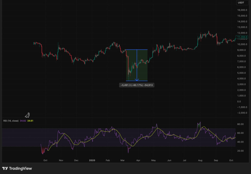 Pada Maret 2020, pandemi COVID-19 melanda hampir seluruh dunia dan memicu penjualan yang besar di pasar keuangan. Pasar saham maupun kripto ikut terdampak dalam hal ini, dengan BTC anjlok sekitar -60,17% dari $9.100 ke $3.650 dalam waktu kurang dari satu minggu. Kejatuhan tajam ini menjadi salah satu contoh fase kapitulasi di pasar kripto pada periode tersebut.