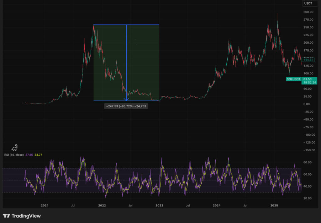 • 🔎 Contoh Kapitulasi: Pada pandemi 2020, Bitcoin turun sekitar -60% akibat pergeseran likuiditas ke aset yang lebih aman. Sementara itu, sentimen negatif terhadap proyek tertentu seperti Solana juga pernah memicu penurunan lebih dari -95% dalam fase bear market.