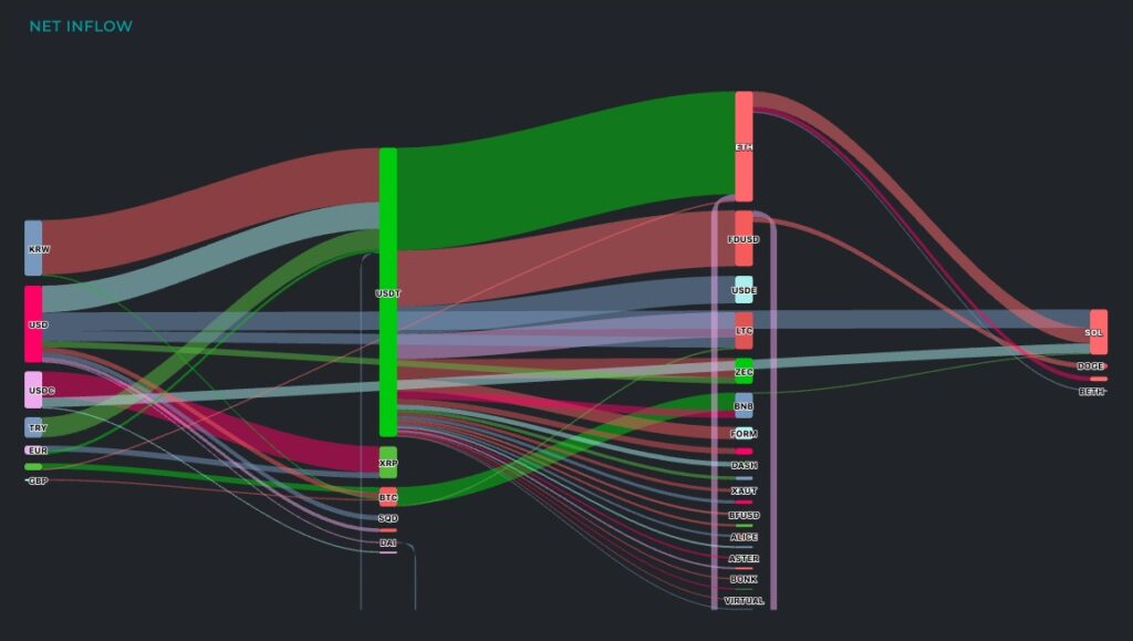 - Cryptometer menampilkan visualisasi real-time dari transisi likuiditas antar aset kripto, misalnya menunjukkan pergerakan uang dari stablecoin (seperti USDT) ke BTC, atau sebaliknya.