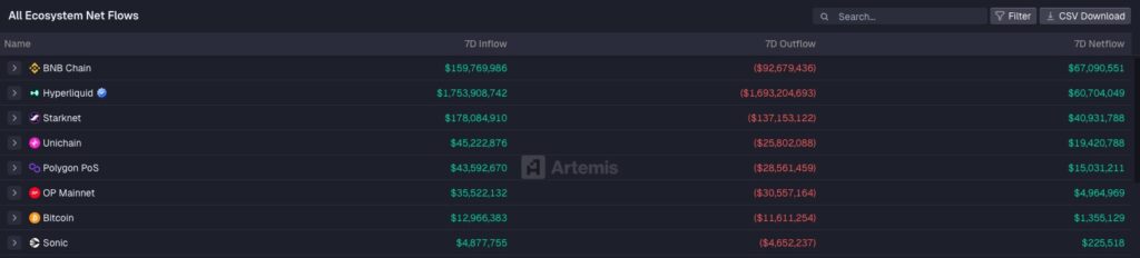 - Artemis menyediakan data money flow antar blockchain. Misalnya, jumlah aset yang mengalir masuk atau keluar dari Ethereum, Base, Solana, atau jaringan lain. Artemis juga menyediakan data aliran stablecoin, melacak seberapa banyak stablecoin yang masuk atau keluar.