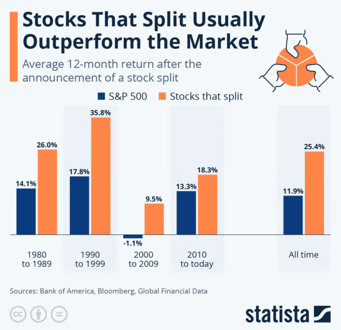 Data ini menunjukkan bahwa saham yang melakukan stock split cenderung mencatat imbal hasil rata-rata 12 bulan yang lebih tinggi dibandingkan indeks S&P 500. Pada berbagai periode waktu, mulai dari 1980-an hingga saat ini, saham hasil stock split secara konsisten mengungguli pasar, termasuk dalam jangka panjang, yang mengindikasikan adanya pola kinerja positif setelah pengumuman stock split.