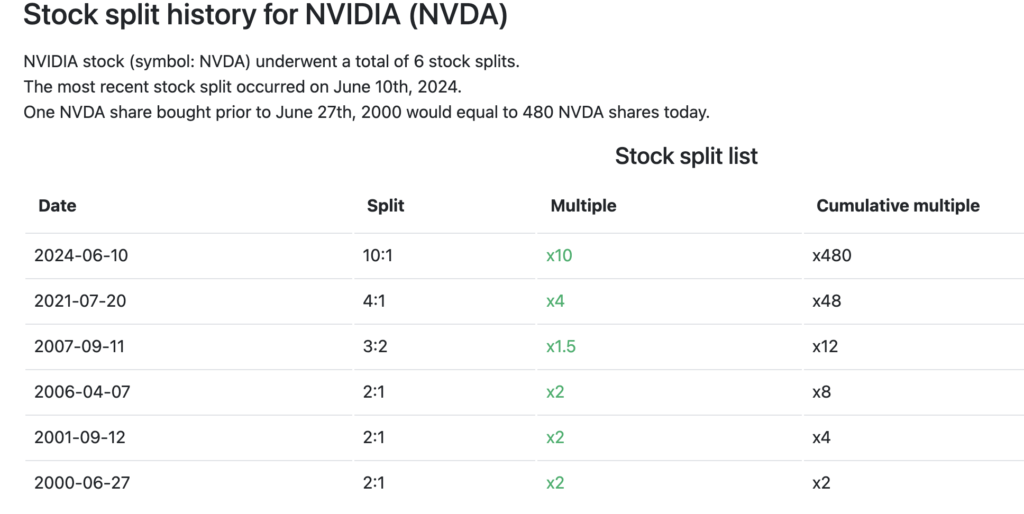 Sepanjang perjalanannya sebagai perusahaan publik sejak IPO pada 1999, Nvidia telah beberapa kali melakukan stock split, dengan total 6 kali forward stock split. Untuk mengetahui jumlah saham setelah serangkaian stock split, seluruh rasio perlu dikalikan secara berurutan.
