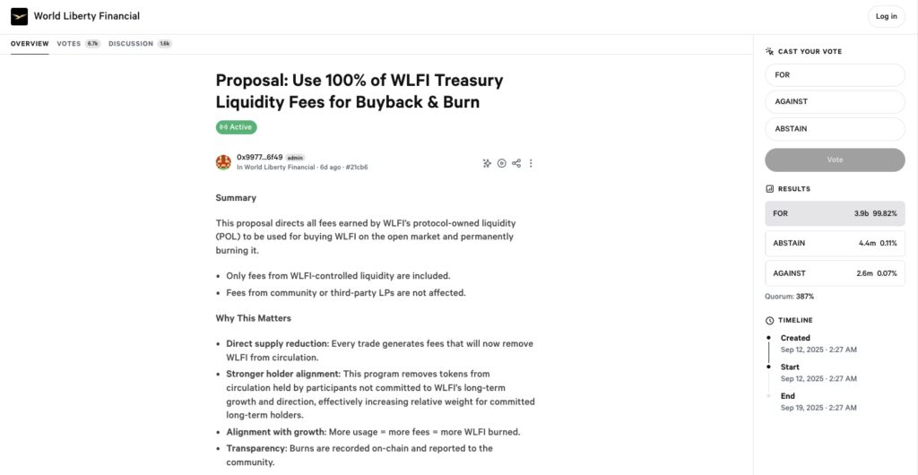 Voting berlangsung pada 12 September 2025 pukul 02:27 AM hingga 19 September 2025 pukul 02:27 AM. Sejauh ini, mayoritas pemilik token WLFI memilih FOR, yang berarti mendukung pengurangan supply.