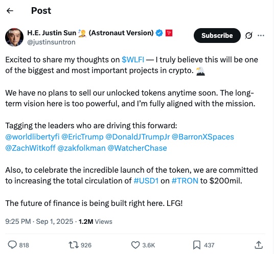 Selain itu, Justin Sun, pendiri blockchain TRON, ikut serta dalam mendukung perkembangan USD1 dengan berkomitmen menambah total sirkulasi stablecoin tersebut di jaringannya hingga mencapai US$200 juta.