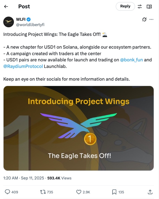 Pada tanggal 11 September 2025, WLFI memperkenalkan Project Wings dengan bekerja sama dengan Raydium, protokol DeFi, dan Bonk.fun, sebuah platform token launchpad di jaringan Solana. Melalui kerja sama ini, USD1 ditetapkan sebagai pair/aset utama di Bonk.fun. Artinya, para trader dan pembuat token wajib menggunakan USD1 saat melakukan transaksi di platform tersebut.
