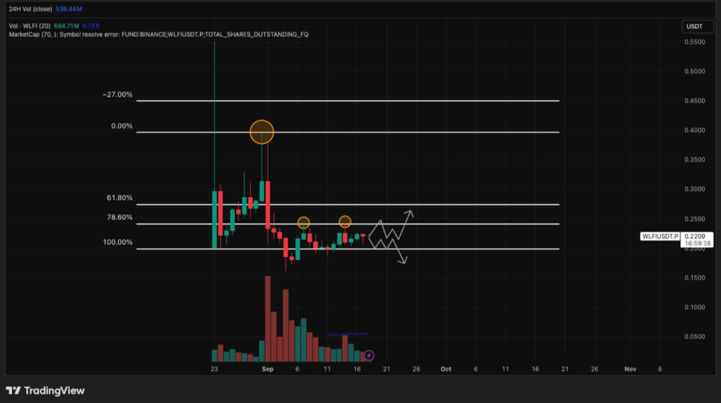 Setelah koreksi, harga $WLFI mengalami rejection dua kali di area Fibonacci Retracement 78,6% (sekitar $0.2409) dan gagal melakukan breakout. Saat ini, harga sedang berada dalam fase konsolidasi. Dengan adanya pembaruan berupa pengurangan supply yang mayoritas holders setujui melalui proposal, hal ini dapat menjadi katalis bullish bagi pergerakan harga $WLFI.