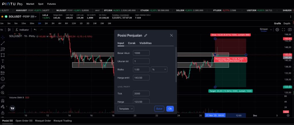 Pada contoh di atas, ukuran posisi tergolong sangat kecil karena hanya mengalokasikan sekitar 4,96 USDT dari total modal 1.000 USDT, atau sekitar 0,496%. Posisi long 1 SOL di harga $124, stop loss ditempatkan di $114 (🔻8,06% dari harga entri) dan take profit di $144 (🟢 16,12% dari harga entri). Dengan skenario ini, kerugian maksimal adalah 10 USDT, sementara potensi keuntungan adalah 20 USDT, sehingga rasio yang digunakan adalah 1:2.