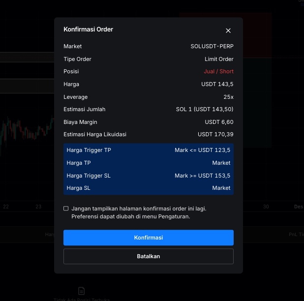 6. Konfirmasi pesanan yang sudah dibuat. Selamat! kamu sudah berhasil menggunakan Risk Reward Ratio di Pintu Futures.
