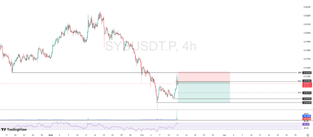Pergerakan naik SYS mulai menunjukkan pelemahan ketika harga mendekati area resistance yang merupakan SBR (resistance become support) di level $0.01542. Zona ini menjadi area krusial karena berpotensi memicu tekanan jual.