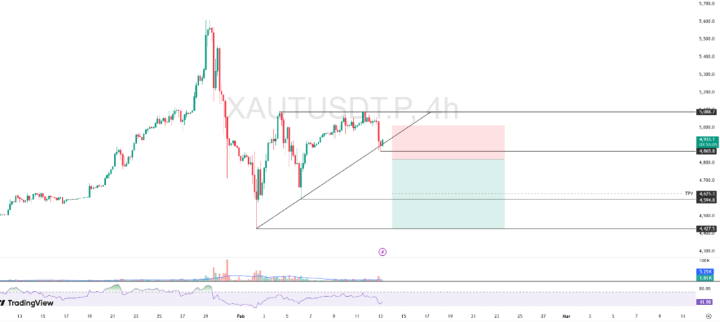 Dalam skenario breakdown tersebut, XAUT berpotensi melanjutkan pelemahan dengan target penurunan menuju area support berikutnya di kisaran $4,594.