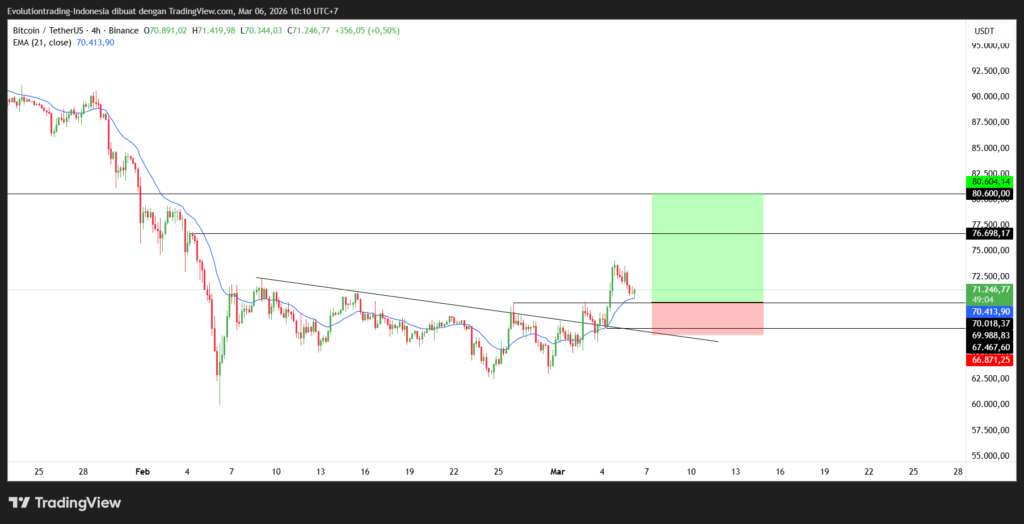 Bitcoin telah menunjukkan perubahan struktur menjadi bullish di timeframe 4 jam dengan pembentukan higher high dan berhasil bertahan di atas 21 EMA timeframe 4 jam.
