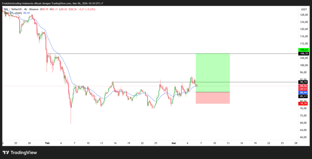 Potensi kenaikan SOL adalah sampai level $100 atau lebih jika resistance $90 di-breakout dengan momentum bullish yang kuat.