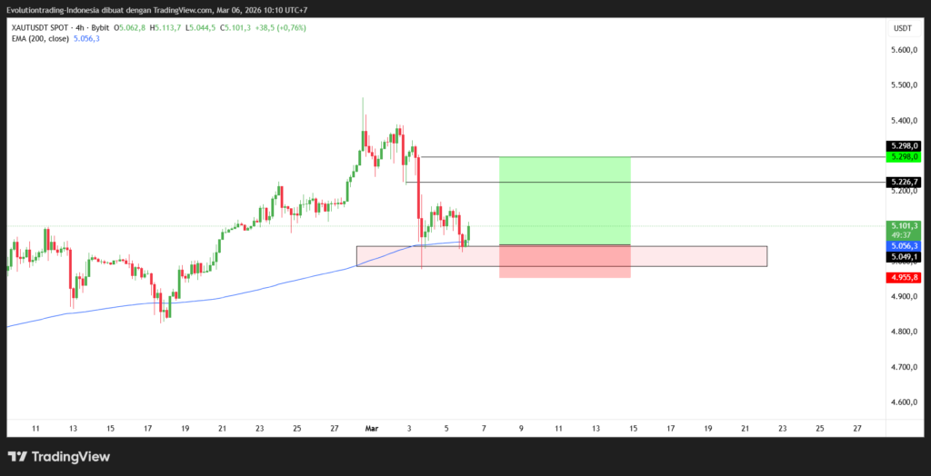 XAUT terpantau membentuk support di sekitar level $5.050 yang juga merupakan garis EMA 200 di timeframe 4 jam. Struktur pasar XAUT menandakan adanya potensi kenaikan yang dapat membawa XAUT naik hingga $5.300.