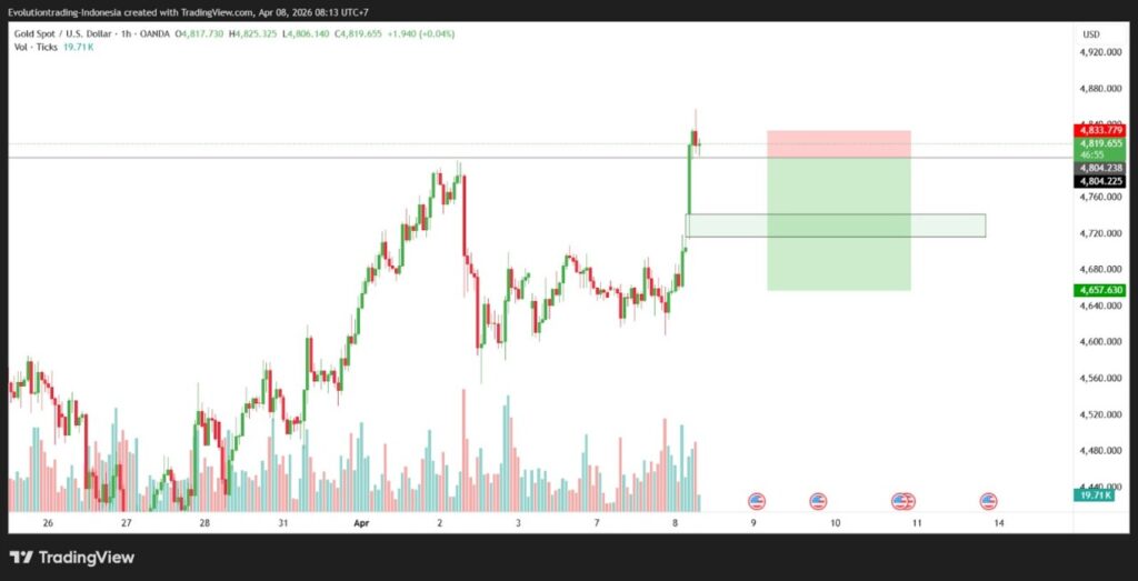 XAUT mengalami lonjakan besar pasca berita gencatan senjata antara Amerika Serikat dan Iran. Lonjakan ini membuat adanya gap yang terbentuk di area antara $4720-$4740.
