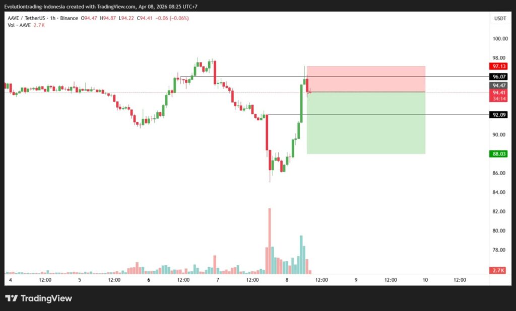 Ada kemungkinan Aave dapat mengetes area resistance become supportnya di $88, dengan potensi pantulan di sekitar area $92.