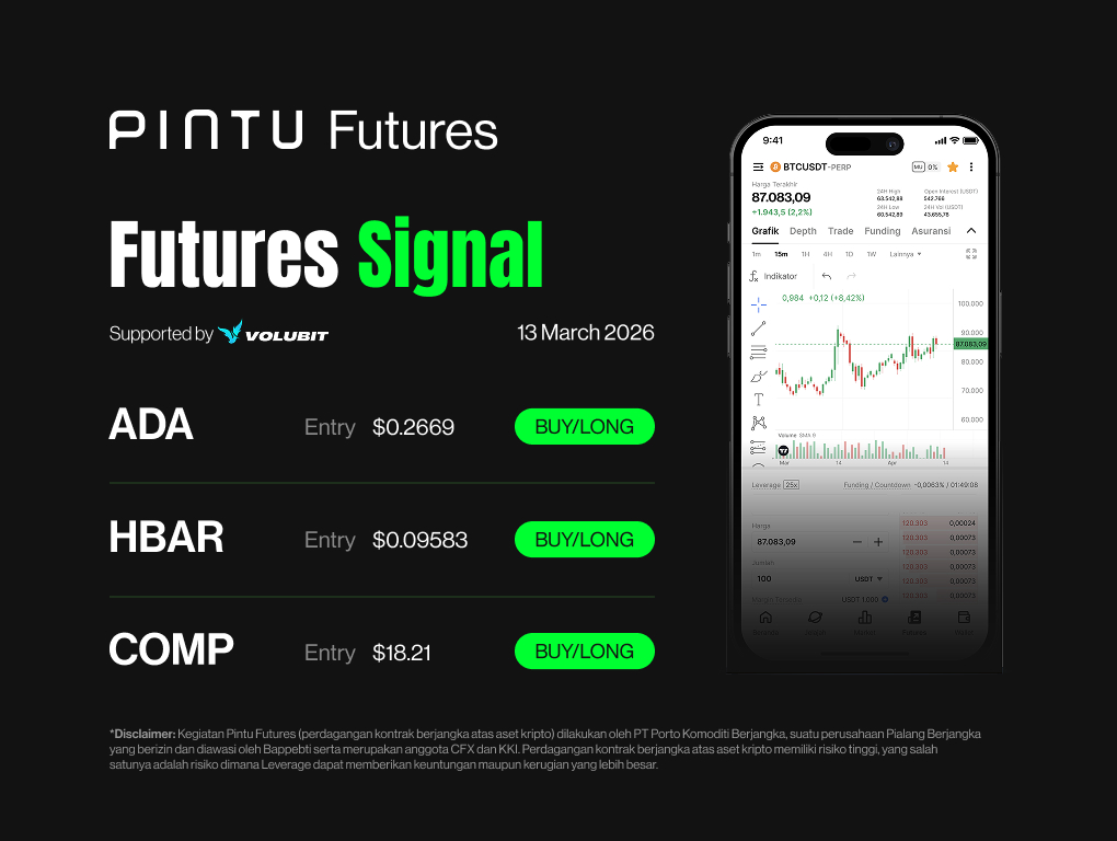 *Disclaimer: Pintu Futures activities (trading futures contracts on crypto assets) are carried out by PT Pintu Kemana Saja (Digital Financial Asset Trader), a Futures Brokerage company licensed and supervised by Bappebti and a member of CFX and KKI. Trading futures contracts on crypto assets has high risks, one of which is the risk that Leverage can provide greater profits or losses.