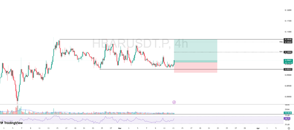 The support level at $0.09265 still serves as a solid area of defense in resisting selling pressure on HBAR. Several times the price approached the level, but managed to bounce back, which indicates a fairly strong buying interest in the zone.