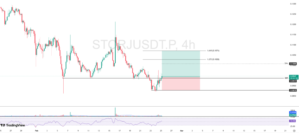 STORJ showed rebound momentum after successfully maintaining support at $0.0878. Currently, the price is testing the SBR (support become resistance) zone at $0.0937 as a crucial area to determine the next direction.