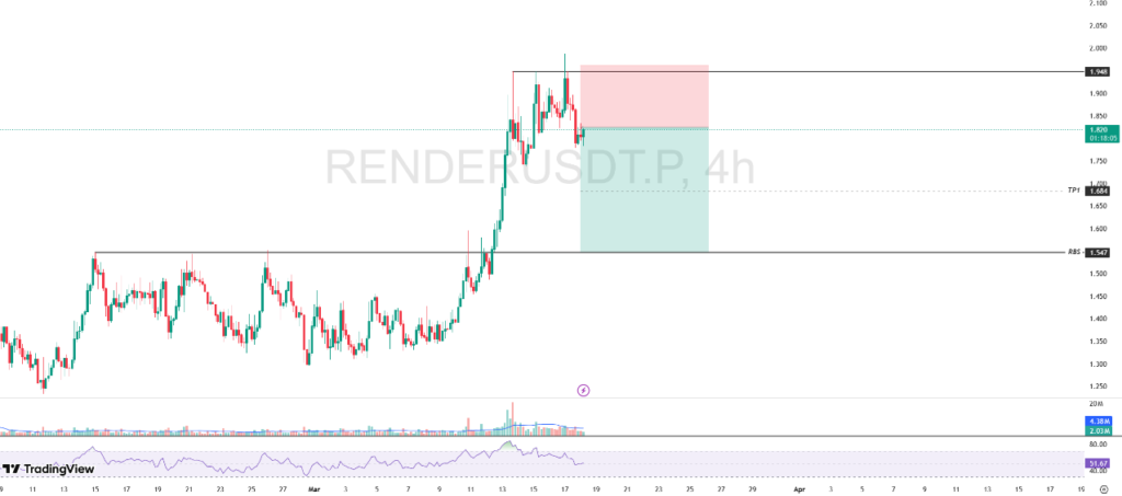 RENDER’s price movement is still held below the horizontal resistance of $1,948, which is a strong supply area and triggers selling pressure. Failure to break this level indicates weakening bullish momentum in the short term.