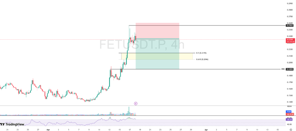 FET’s bullish momentum started to show weakness after touching the resistance at $0.2563. The formation of a long upper wick on the candlestick indicated significant selling pressure in the area.