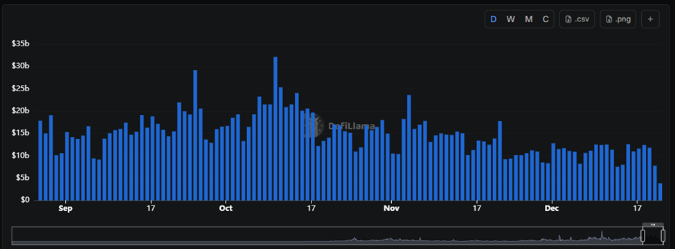 - Holiday Season Slowdown: On-chain activity and DEX volumes are declining (down 3.7% this week) as the market enters the Christmas and New Year period, likely resulting in light trading volume for major assets.