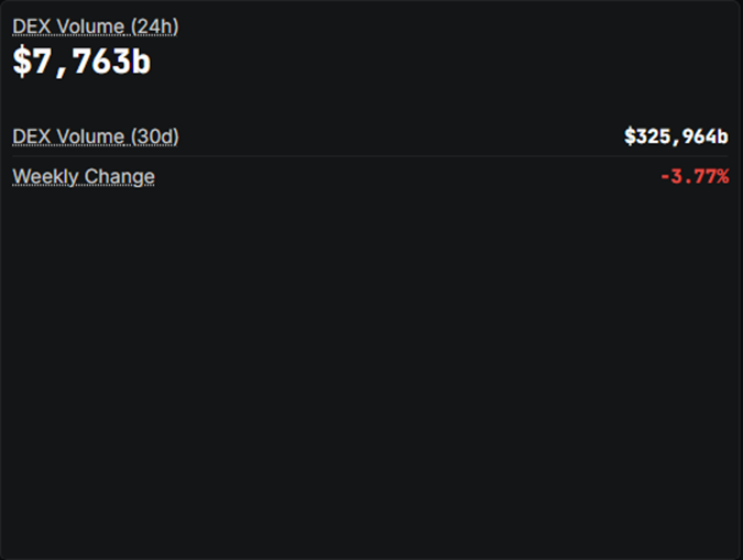 The volume of decentralized exchanges (DEXs) has seen a decline in the past few days. Overall, 1 week back, the trading volume on DEXs was down 3.7% at $7.73 billion. This indicates that on-chain activity has seen a decline in investor interest in recent days.