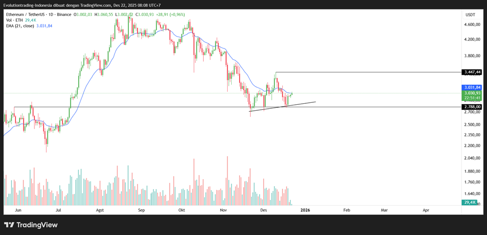 Ethereum needs to break the 21-day EMA indicator to confirm its bullish momentum, with the target of testing its last “high” in the $3400 area formed on December 10, 2025.
