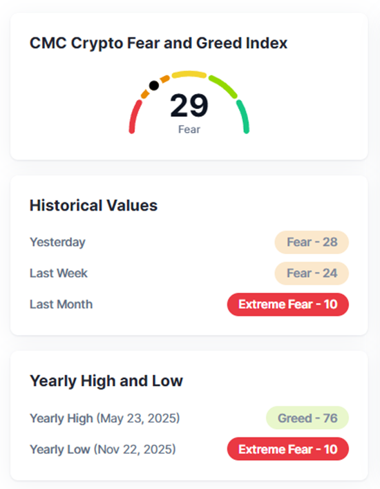 Market sentiment briefly climbed into”Fear” territory with this week closing at 29, up from last week’s “Extreme Fear” index. This shows the start of confidence amidst a consolidating market. Nonetheless, investors are still showing reluctance in investing aggressively in the crypto market, especially towards the end of 2025.