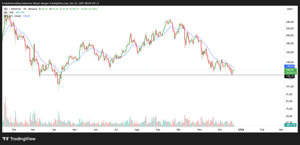 Bearish pressure is still dominant in Solana. Solana is currently testing its important support in the $118 area. However, the candlestick formation shows Solana’s price action is not convincing, especially with Solana below the 21-day EMA indicator.