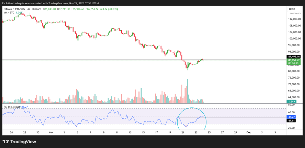 On the 4-hour timeframe, Bitcoin’s Relative Strength Index (RSI) is already showing a very strong potential reversal. The RSI value has returned from the oversold area and formed a higher high. For further upside confirmation, we can monitor whether Bitcoin can break its support-become-resistance level in the $87,500 area.