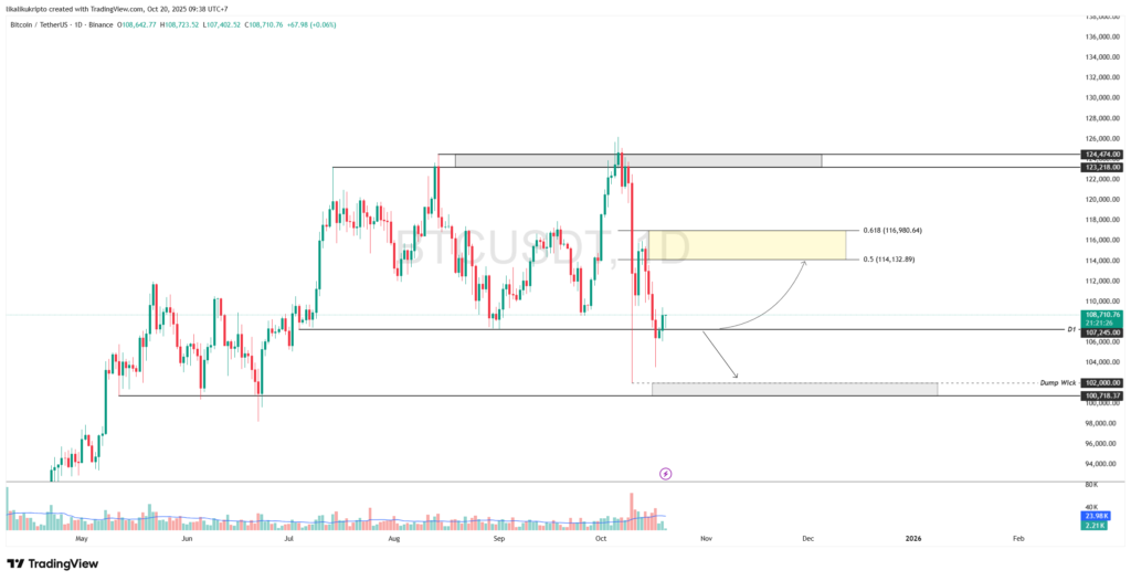 Conversely, if the price fails to hold and closes below the $107.245 support level again, this would indicate that the breakout was a fakeout. Rejection of this level will reopen the potential for further weakness. The immediate downside target is at the next significant support area in the $100,718 – $102,000 zone, which previously served as a liquidity area (dump wick).